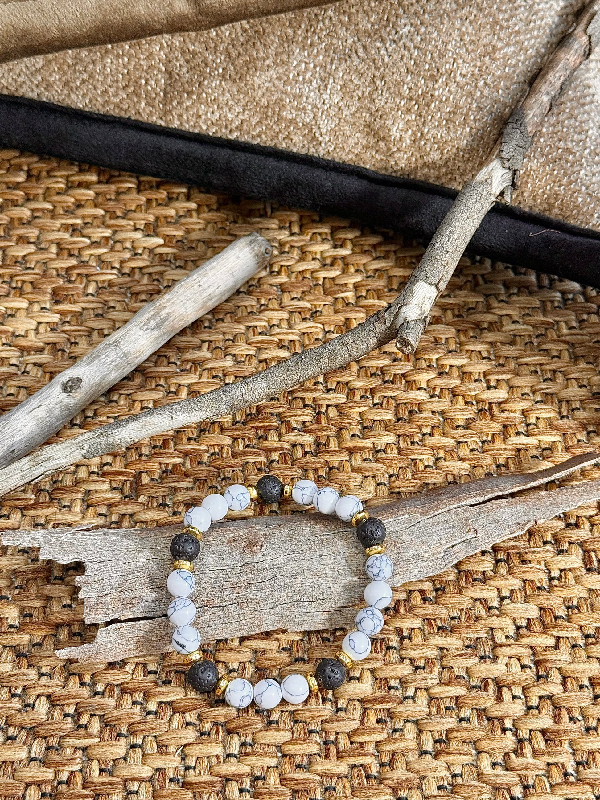 Made with carefully selected natural stone beads, including howlite, lava stone and gold accents. Each bracelet is unique, showcasing subtle natural variations in color and pattern.