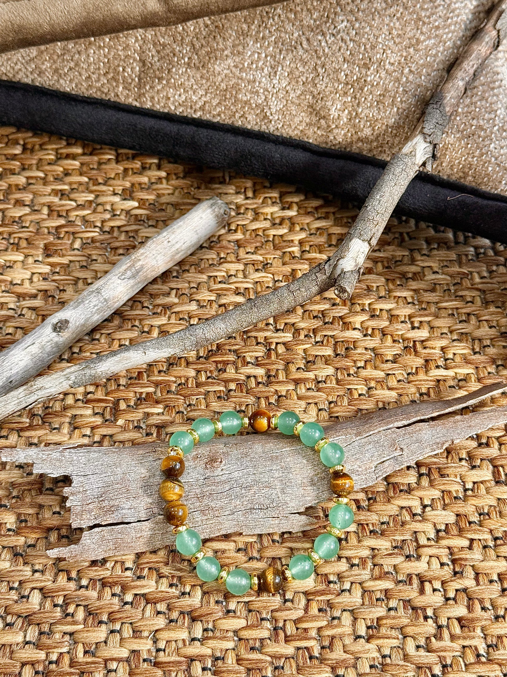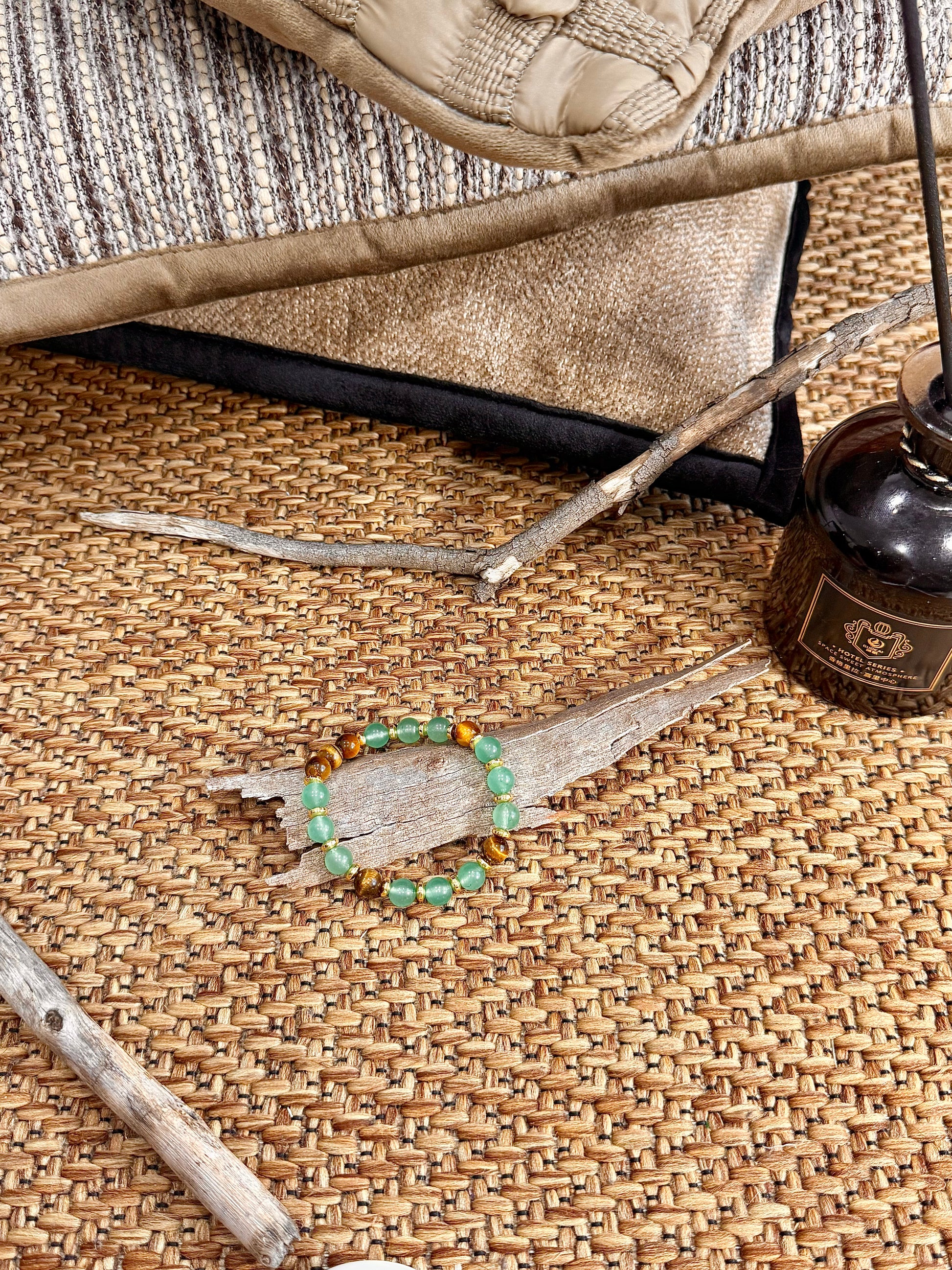 Made with carefully selected natural stone beads, including green aventurine and tiger’s eye. Each bracelet is unique, showcasing subtle natural variations in color and pattern.